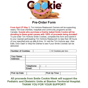 Tim Hortons Smile Cookie Week – April 27th – May 3rd Get your Smile Cookie starting April 27th and support the Stanton Territorial Hospital Foundation. All proceeds from Smile Cookie week will support equipment and patient-care initiatives for the Pediatric and Obstetric Units at Stanton Territorial Ho , ...Late Night Shop at Center Ice Plaza5:00pm - 8:00pmCrazy For You7:30pm - 10:00pm