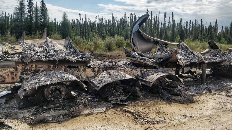 The remains of a tanker that burned in a fire south of Fort Providence on July 26, 2022