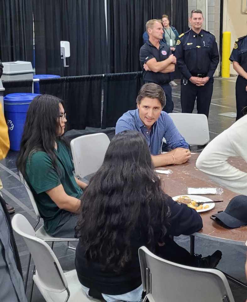 Prime Minister Justin Trudeau arrived at the evacuation centre set up in the Edmonton Expo Centre around 6pm on Friday evening. He toured the designated dining area and sat down to talk with evacuees, including Diana Neill and her family.