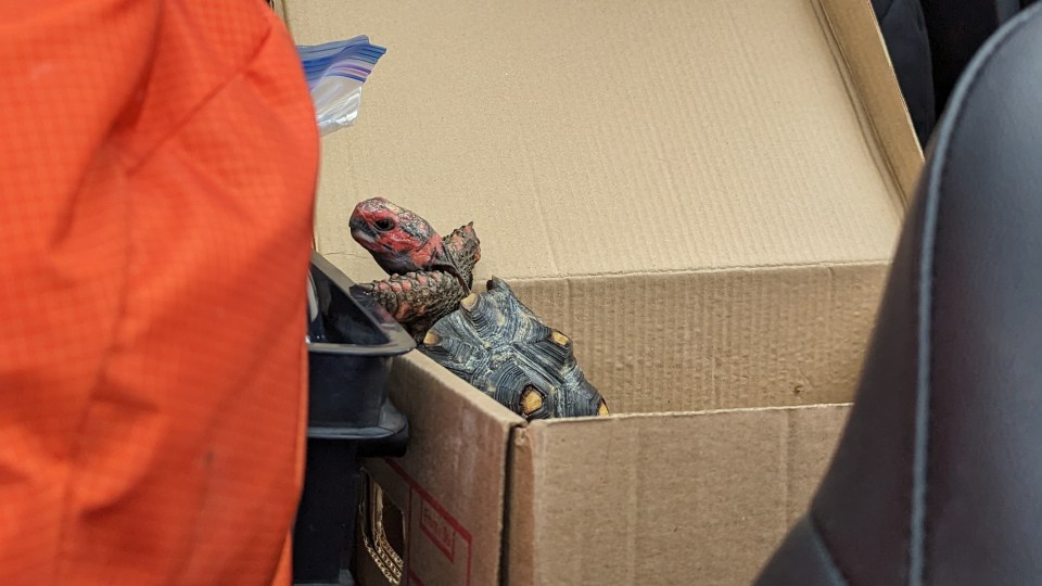 7:41 – I think this is the first evacuating tortoise we’ve seen. This is Pilkington, a red footed tortoise who is visiting Alberta for the first time with Peter.