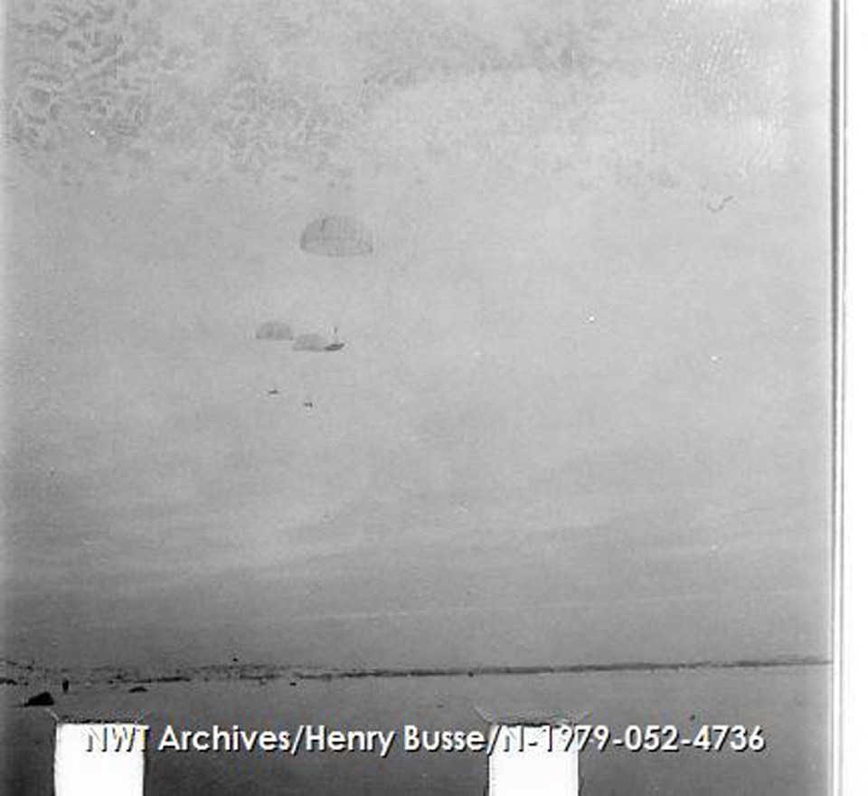 Parachute troops and equipment above the ice outside Yellowknife in the 1950s, during training. NWT Archives/Henry Busse fonds/N-1979-052: 4736