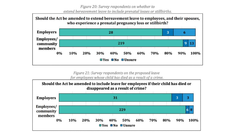 All respondents were overwhelmingly supportive of leave related to the death or disappearance of a child, and a proposal to extend bereavement leave to include employees and spouses who experience a prenatal pregnancy loss.