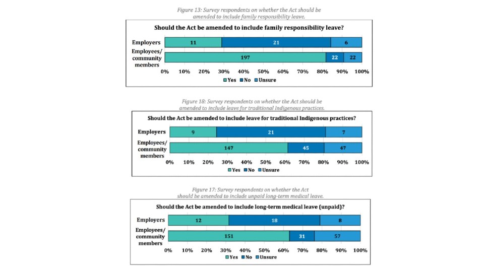 While the majority of employees and others supported proposed family responsibility leave, it was opposed by most employers. More employers also opposed proposed long-term medical leave and leave for traditional Indigenous practices, suggestions supported by many employees.
