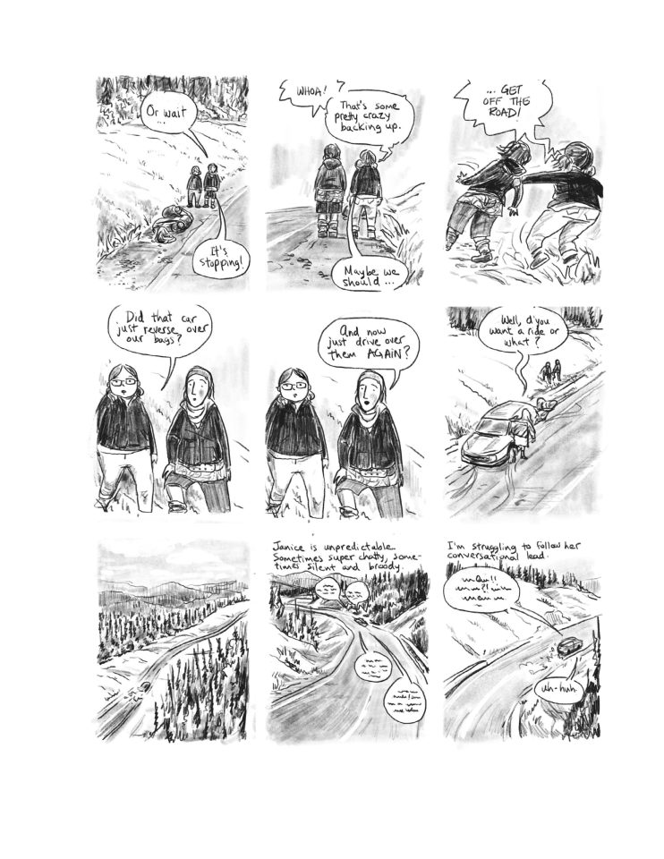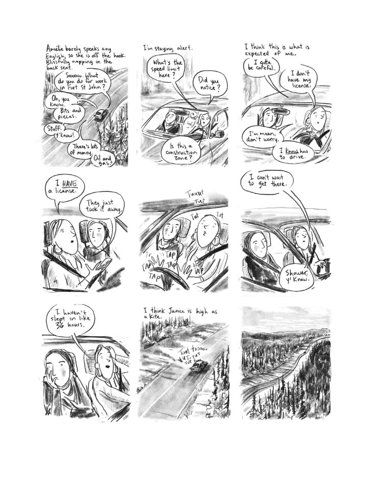 A page of Alison McCreesh artwork from Degrees of Separation, documenting her hitchhiking trip to the Yukon in 2008.