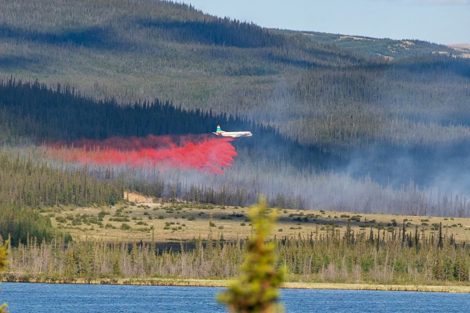 An Lockheed Electra L-188 Air Tanker drops fire retardant on the Bandy Lake fire outside of Norman Wells on June 16, 2024. Photo: Nicky Lynn Richards