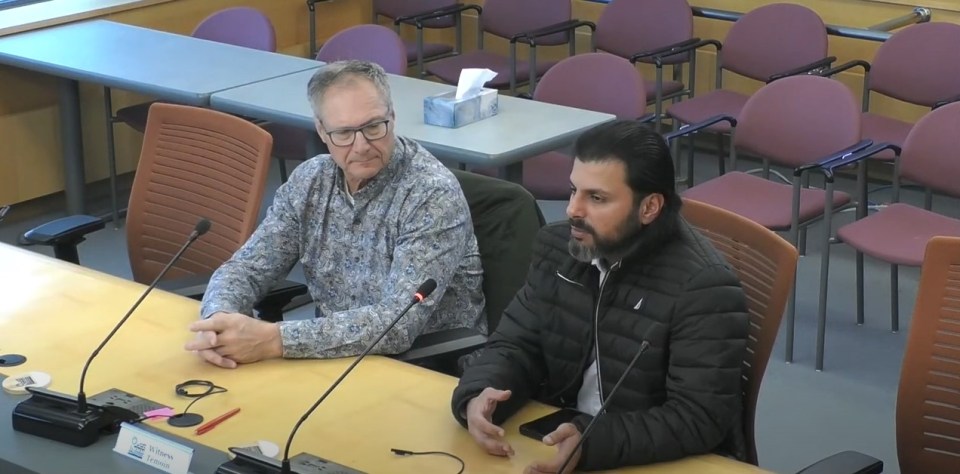 Glenn Tuchwisky, construction manager of Borealis Development Inc, left, and Afzal Suri, co-founder of Borealis Development Inc, right, speak to MLAs at a public briefing in November 2024.