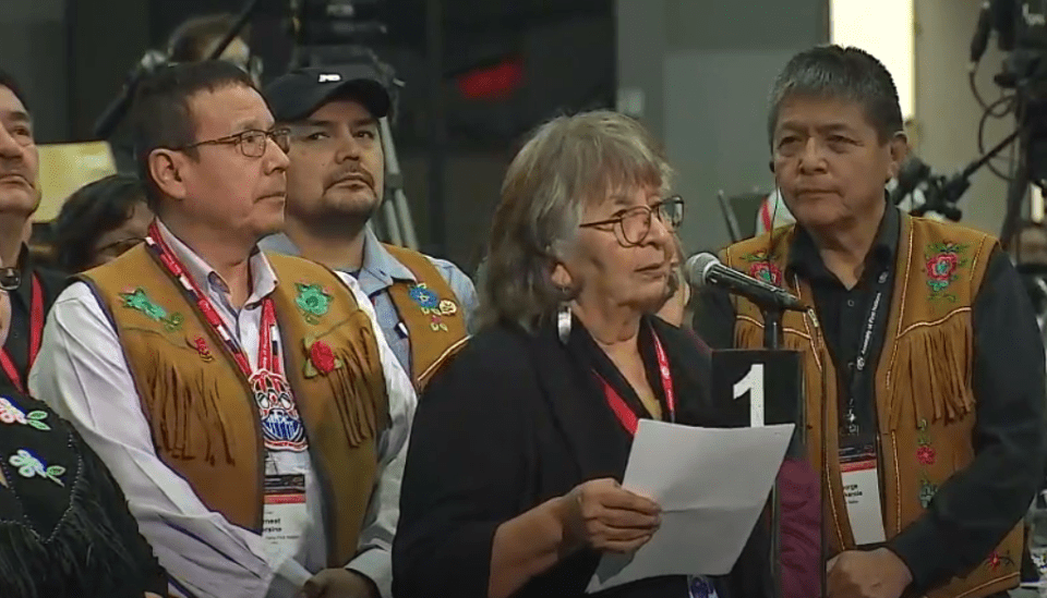 The Dene Nation’s resolution was backed by 245 voters with just three people abstaining and one person voting against it. After the resolution passed, the room filled with applause and several Dene chiefs rose from their chairs in celebration.