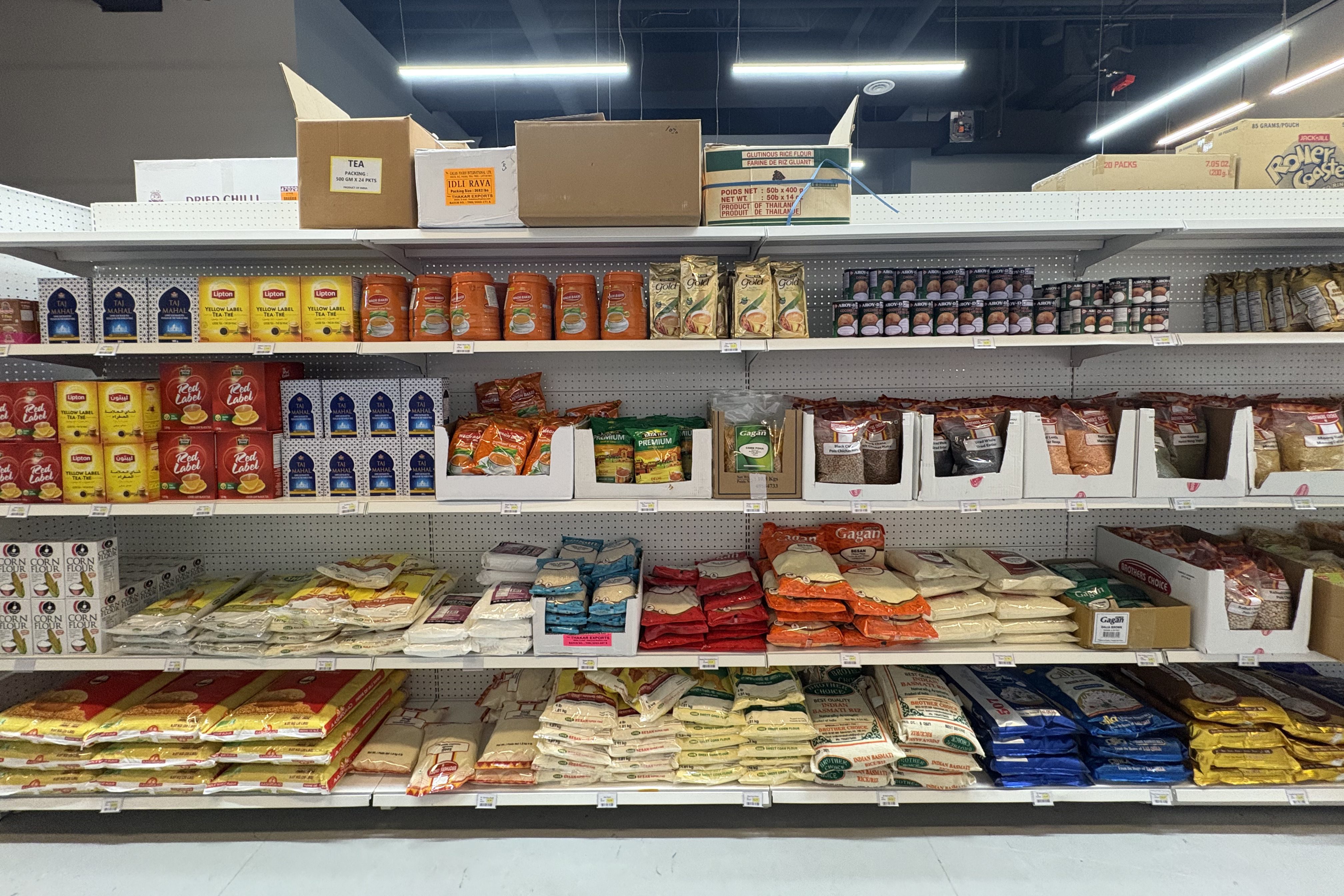 Varieties of flour stacked on shelves. Aastha Sethi/Cabin Radio