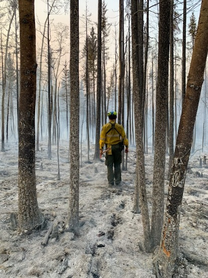A firefighter on the Wood Buffalo Complex fire line near Fort Smith in September 2023. Photo: Parks Canada