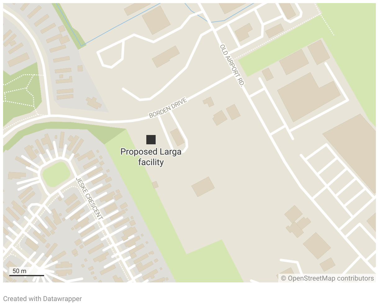 Larga wants to build at 346 Borden Drive, where an industrial and commercial zone – featuring a Mary Brown’s restaurant as a neighbour – gradually gives way to the homes of streets like Jeske Crescent.