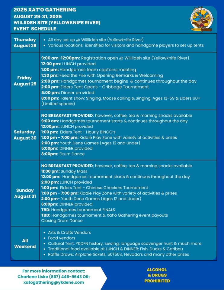 Planned events include a $150,000 men’s handgames tournament, a cribbage tournament, talent show, bingo, storytelling, sewing, a language scavenger hunt, Dene games and a bouncy castle.