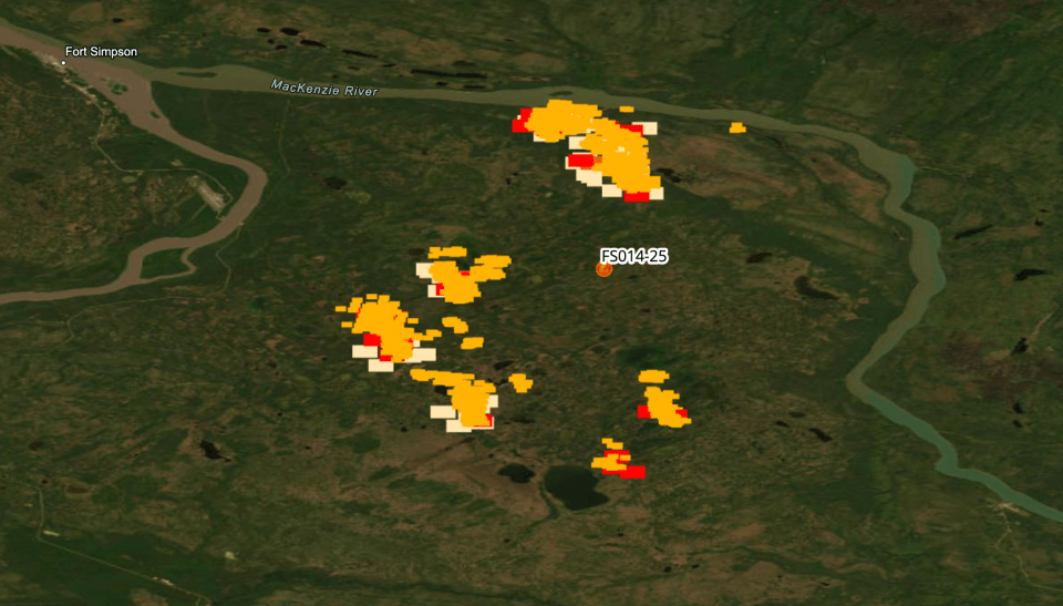 The map between Fort Simpson and Jean Marie River suggests fire FS014 is currently noodling around a bit. The red spots below are the ones detected at 12:30, everything else is from earlier.