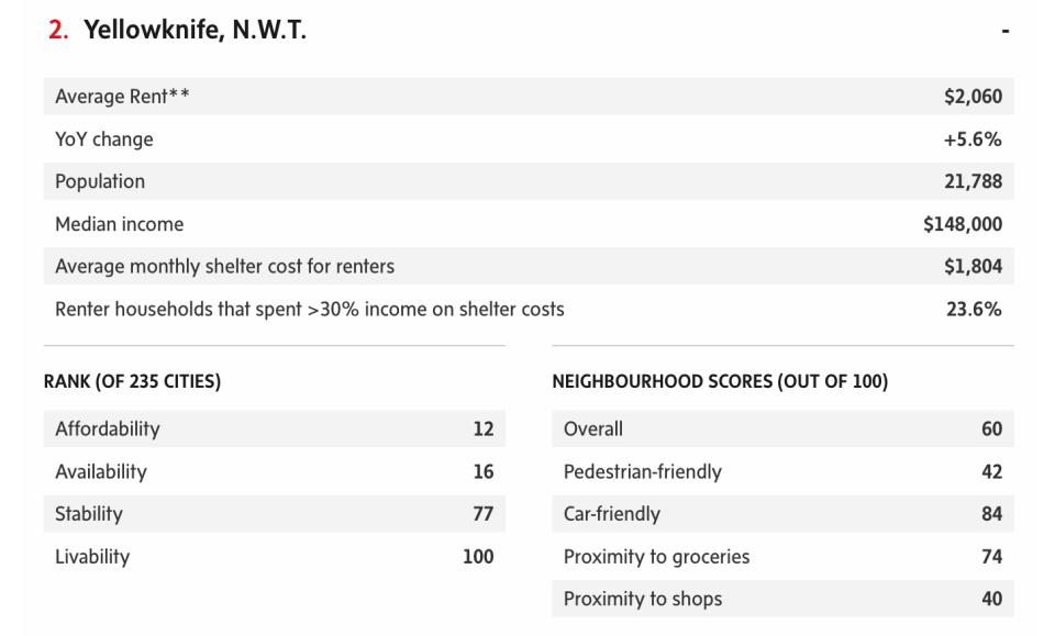 In the ranking, published this week, the NWT capital is behind only Edmonton in a tool designed to help people “find the best cities to rent.”