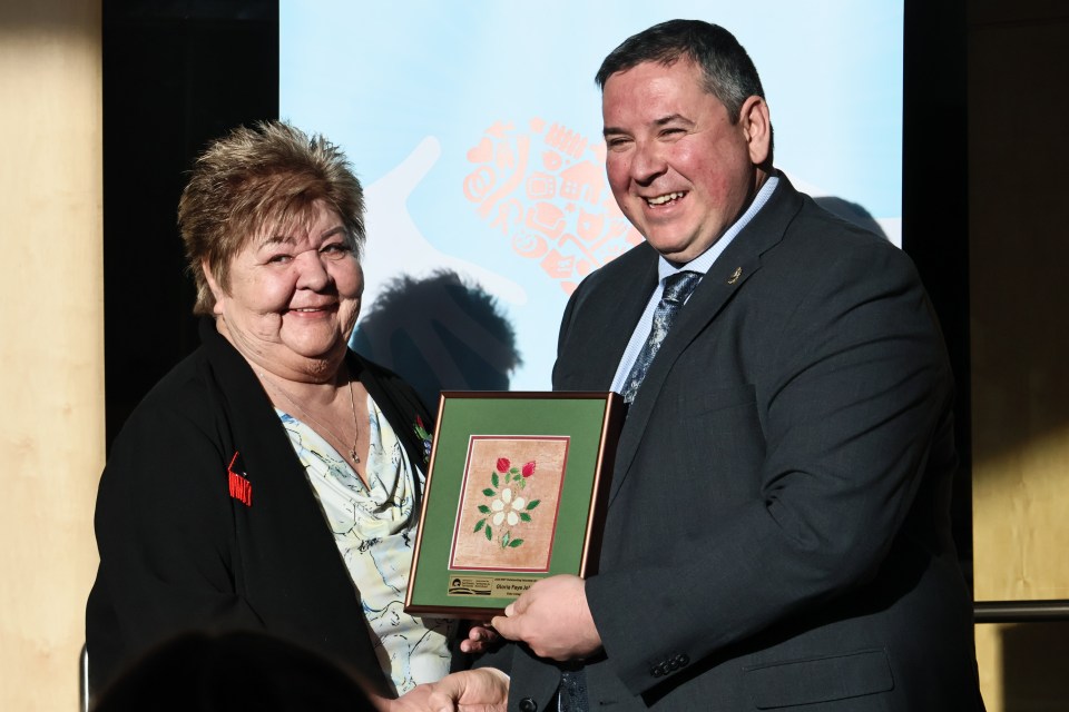 Elder award recipient Gloria Faye Johns with communities minister Vince McKay. Aastha Sethi/Cabin Radio