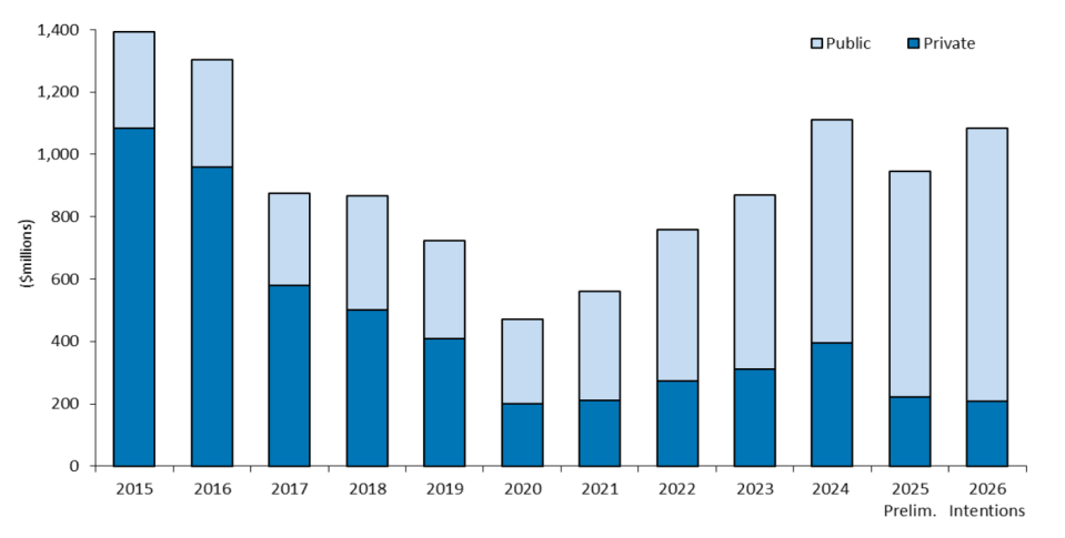 “The sustained activity in public investment can in part be attributed to projects such as the Giant Mine Remediation Project. In 2026, public expenditures are expected to increase by 20.9%, while private expenditures are expected to decline by 6.9%.”