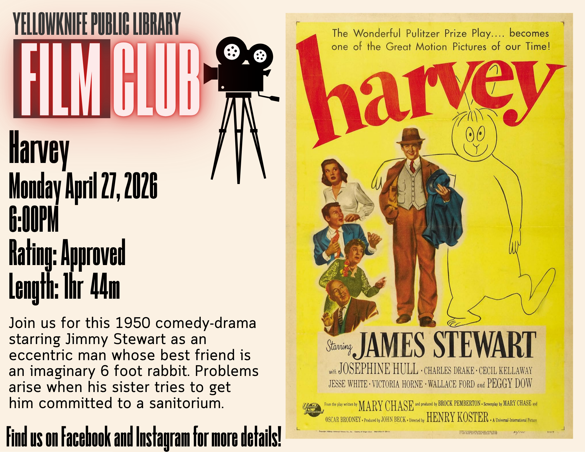 Join us at the Yellowknife Public Library for a Classic Movie Monday screening of Harvey.