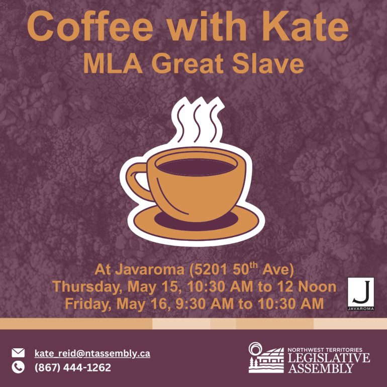Drop by at Javaroma for a one-on-one conversation with Great Slave MLA Kate Reid. Coffee — or whatever’s your favourite drink — is on us!