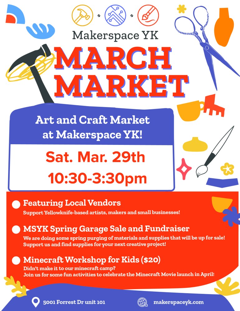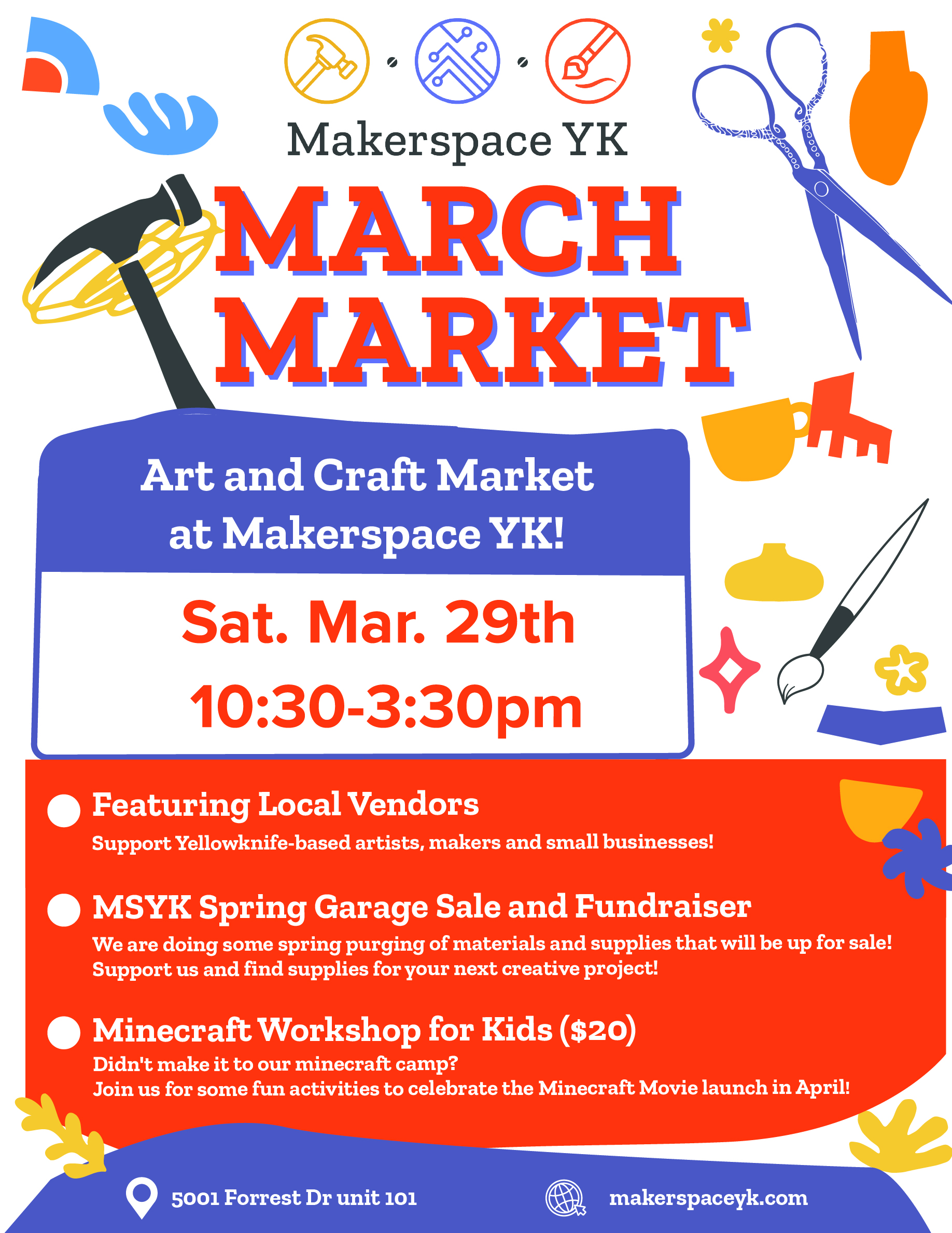 Makerspace YK’s Maker Market is a one day craft market held at Makerspace YK. It is designed to be a dynamic and inclusive platform, supporting artists, artisans, and creators across various fields, including visual arts, woodworking, electronics, Indigenous crafts, and DIY projects.